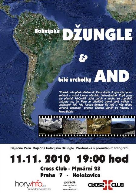 Přijďte se podívat 11. listopadu 2010 v 19hodin na fotografie a poslechnout si zajímavé vyprávění z cest manželů Idy a Standy Vaňkových; uvidíte nádherné fotografie z treku v Cordillera Blanca, podíváte se na sopku Misti a posléze sestoupíte do kaňonu Colca. Poznáte mnoho indiánských památek a jako třešničkou na dortu bude několik fotografií z výletu do bolivijské amazonské džungle. A to vše v Cross Club, Plynární 23, Praha 7 – Holešovice.
